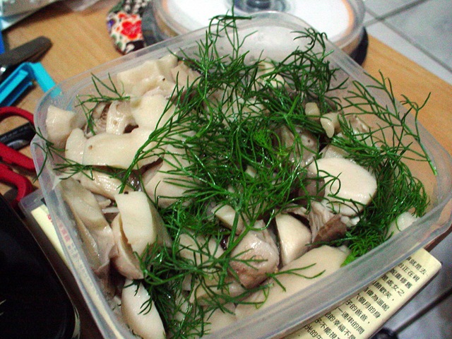 清明過後,天氣漸漸暖和,我也開始準備冷盤當作晚餐的備料:將杏鮑菇、鮑魚菇、段木香菇隨意切成一口大小,因為以水煮烹調會將精華熬進湯頭裡,清炒則不易熟而費瓦斯,我便取半杯水,以平底鍋半煮半蒸地炊熟的方式,保留新鮮菇類的爽脆口感與鮮甜,放涼後淋上油醋醬涼拌,便是一道清爽的夏日冷盤。